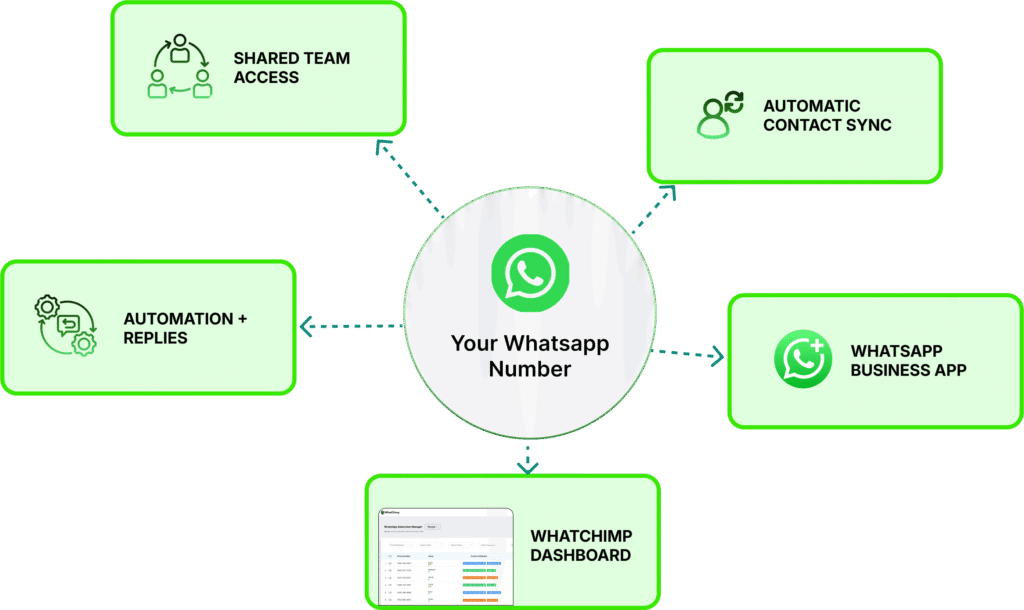 Keep your WhatsApp Business number on your phone while unlocking team collaboration and automation through WhatChimp. Handle sales communications smarter, faster, and with full control.