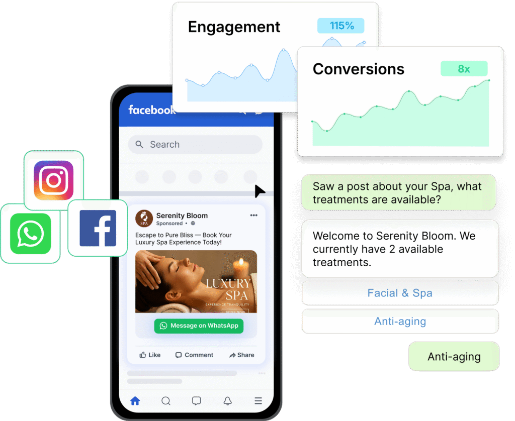 Create ads on platforms like Facebook and Instagram that start WhatsApp chats with a single click. Capture opt-ins and convert interest faster by making it easy for customers to connect.