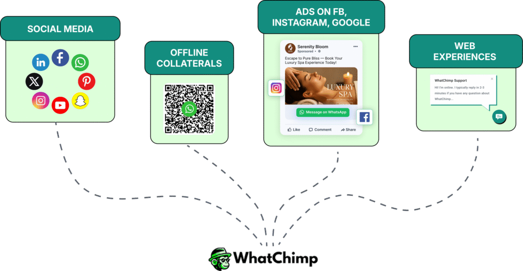 Connect with your audience across platforms. WhatChimp transforms social media, offline materials, ads on Facebook, Instagram, and Google, and your website into real-time WhatsApp chats so every interaction turns into a meaningful conversation.
