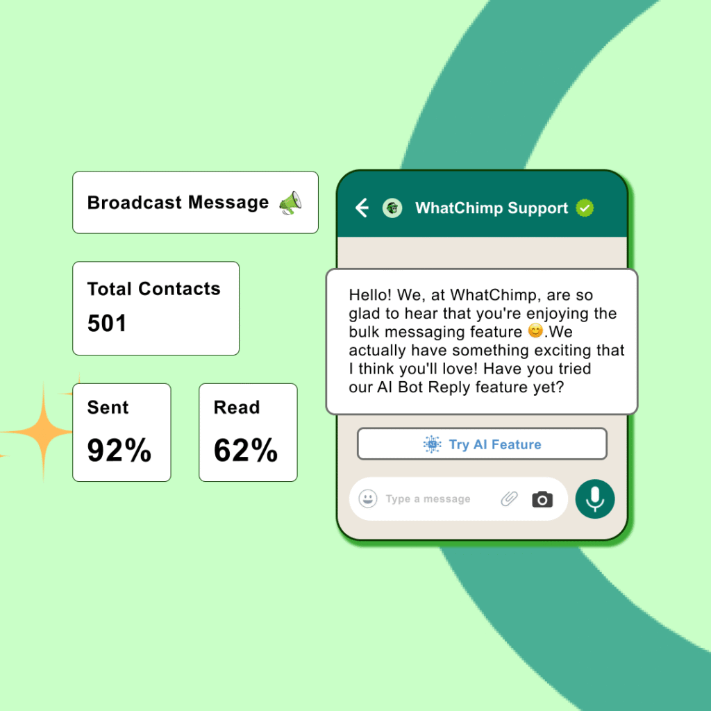 WhatChimp lets you send campaigns, answer questions, show products, and manage teamwork all in WhatsApp.