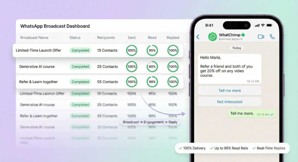 - Bulk Broadcasting: Send personalized messages to thousands of contacts in minutes with 99% delivery rate